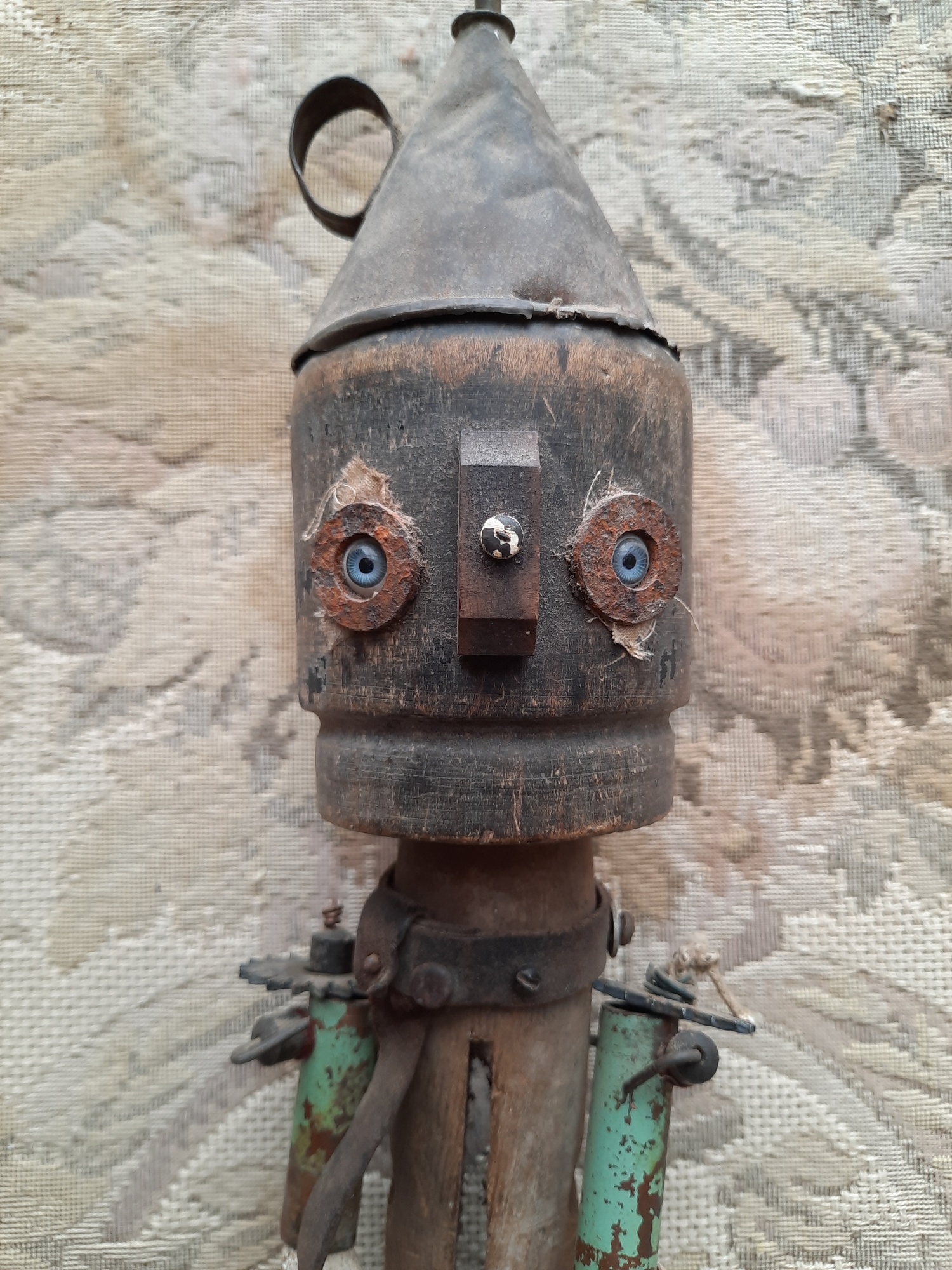 Rust Bucket Workshop studied Art and Design at Stroud College and has exhibited in various group shows and has had two solo exhibitions in Gloucester and Portsmouth. She works intuitively using a pallette of pewter and painted tin pots, together with purpose and useful whatnots, mixing the forgotten, dysfunctional and scrapped, giving life to the broken and unwanted. A mechanical ‘frankenstein’ of melancholic means give beauty to trashed and rejected machines, moving scrap into sculptural artisan delights.